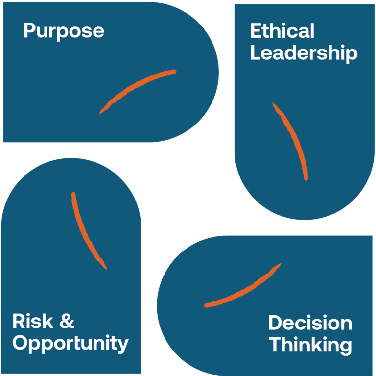 These interrelated elements are Purpose, Ethical Leadership, Decision Thinking, and Risk and Opportunity.